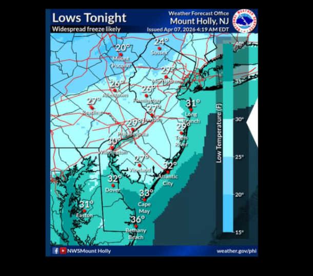 According to the National Weather Service, at least 13 counties will experience freezing conditions from Tuesday night into Wednesday morning. Overnight temperatures are forecast to drop into the low 20s to low 30s statewide, creating a risk for frost and freeze damage. Southern counties, where the growing season has already begun, are among the most affected. These include Atlantic, Burlington, Camden, Cape May, Cumberland, Gloucester, Mercer, Monmouth, Ocean, and Salem counties.